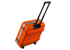 Der Trolley aus hochschlagfestem Polyethylen hat Innenabmessungen 510 mm Länge, 510 mm Breite und 165 mm Höhe. Er eignet sich ideal für den Transport von Kameraausrüstung, Werkzeug oder Messgeräten im Outdooreinsatz, denn der Behälter ist aufgrund seiner Materialbeschaffenheit extrem widerstandsfähig gegen physische und chemische Einflüsse. Auf Wunsch kann der Behälter alternativ als Kofferausführung ohne Rollen und mittig verbauten Griff gefertigt werden. Zusätzliche mechanische und elektronische Einbauten sowie der Anbau von Behälterversteifungen und alternativen Beschlagteilen sind auf Anfrage möglich.