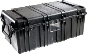 Ausstattung/Eigenschaften: Die verstärkte Wabenstruktur von Behälter und Deckel hält schwere Ausrüstungen oder ein mehrfaches Stapeln, Aufbewahrung von Papieren außerhalb des Behälters in Dokumentenfach, Deckelhalter aus Metall halten den Deckel in geöffneter Position, große, einklappbare Griffe ermöglichen Tragen durch 2 Personen, zwei automatische Druckausgleichsventile (gleichen den Druck im Koffer aus und lassen kein Wasser eindringen), wasserdicht, bruchsicher und staubdicht, beschränkte lebenslange Garantie von Peli. Optional erhältlich: gefüllt mit Würfelschaum Pick N Pluck und Noppenschaumstoff im Kofferdeckel, Rollenset (4 Lenkrollen), 4 Füße für den Transport mit Gabelstaplern.